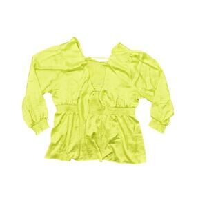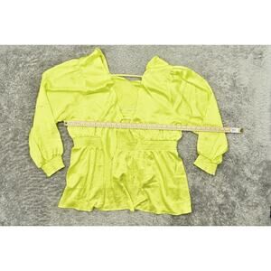 For sale is a preowned Torrid blouse in a size 4 Plus. This women's top is made of polyester, featuring a vibrant green color. It measures 24 in pit to pit and 32 in in length, providing a comfortable and stylish fit. Ideal for a variety of occasions, this blouse adds a pop of color to any wardrobe.
