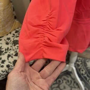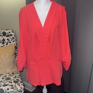Features: open front, front pockets, tailored fit, lined, stretch, ruched 3/4 length sleeves