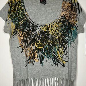 Torrid Plus Size Feather Print Fringe detail Grey Shirt Size Large/12