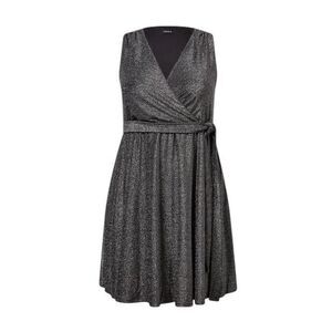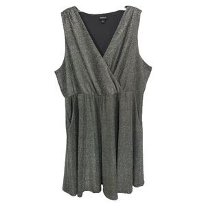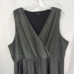 Torrid 2X dress, plus size shimmer wrap dress, sleeveless party dress, Torrid evening wear, metallic gray dress, plus size wrap dress, flattering V-neck dress, Torrid plus size fashion, sleeveless holiday dress, sparkly formal dress, Torrid 2X cocktail dress, lightweight shimmer dress, elegant wrap-style dress, plus size special occasion dress, trendy metallic sleeveless dress.