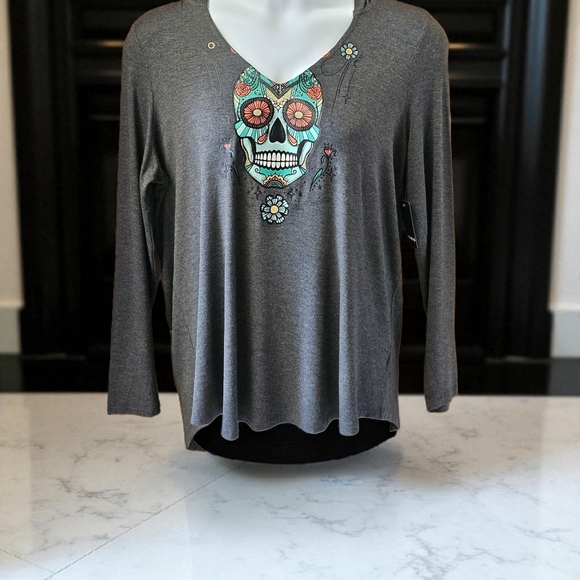 New chic gray super soft long sleeves with a colorful floral skull design. Ideal for casual wear. Made of 100% cotton. New with tags never worn It will be your new go-to comfy top. For those of you who like to live on the edge.