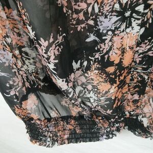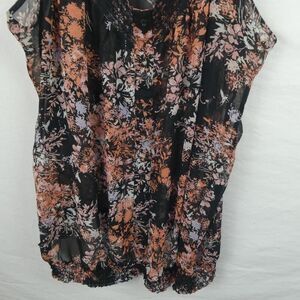 Machine washable polyester. Sheer, wear with cute bra/bralette/bandau/etc. Black with crochet lace detailing, all over floral print, non-functional button down front, and elasticized bottom. Torrid size 4, item 512602