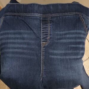 Pull on jeans, high rise. Whiskering on upper thighs. Thicker elastic waistband for comfort and helps puckering in back when you bend. No hardware, super stretchy and comfortable. Excellent like new condition!