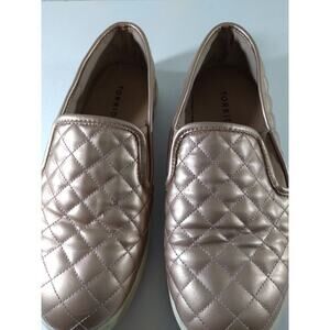 Add a touch of elegance to your wardrobe with these Torrid pull-on loafers in a beautiful gold color. These slip-ons are perfect for any occasion, from casual outings to business meetings, and even parties. The round toe shape and standard shoe width provide comfort, while the faux leather upper material gives a stylish and trendy look.