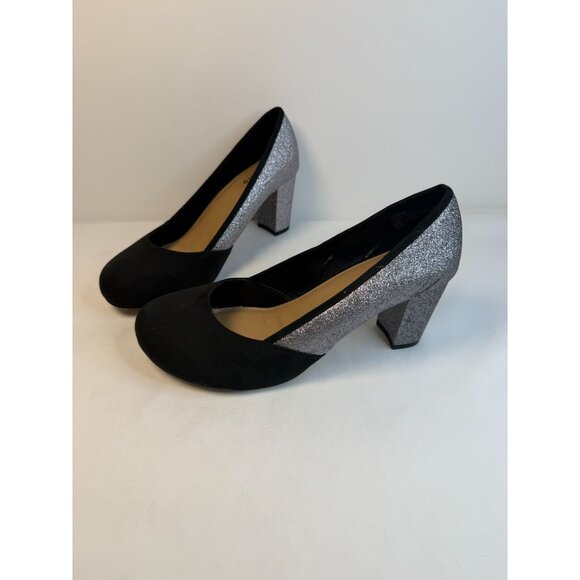 FEATURES/ACCENTS: Mid block heel. 3" Block Heel. Rpound toe. Black with Silver glitter colors. Slip on style.
