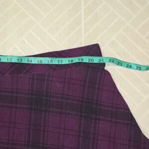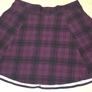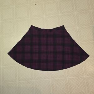 Gently worn skater skirt with elastic waist and deep pockets. Purple plaid print knit fabric. See photos for measurements and details