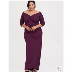 Torrid purple stretch Jersey ruched off shoulder maxi gown.