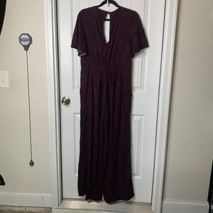 Beautiful plum purple maxi dress with subtle floral pattern. Features flutter sleeves, V-neckline with back keyhole detail, and elastic waist for a flattering fit. Perfect for weddings, special occasions, or romantic date nights. The flowing silhouette creates an elegant look while remaining comfortable. In excellent condition with no flaws.