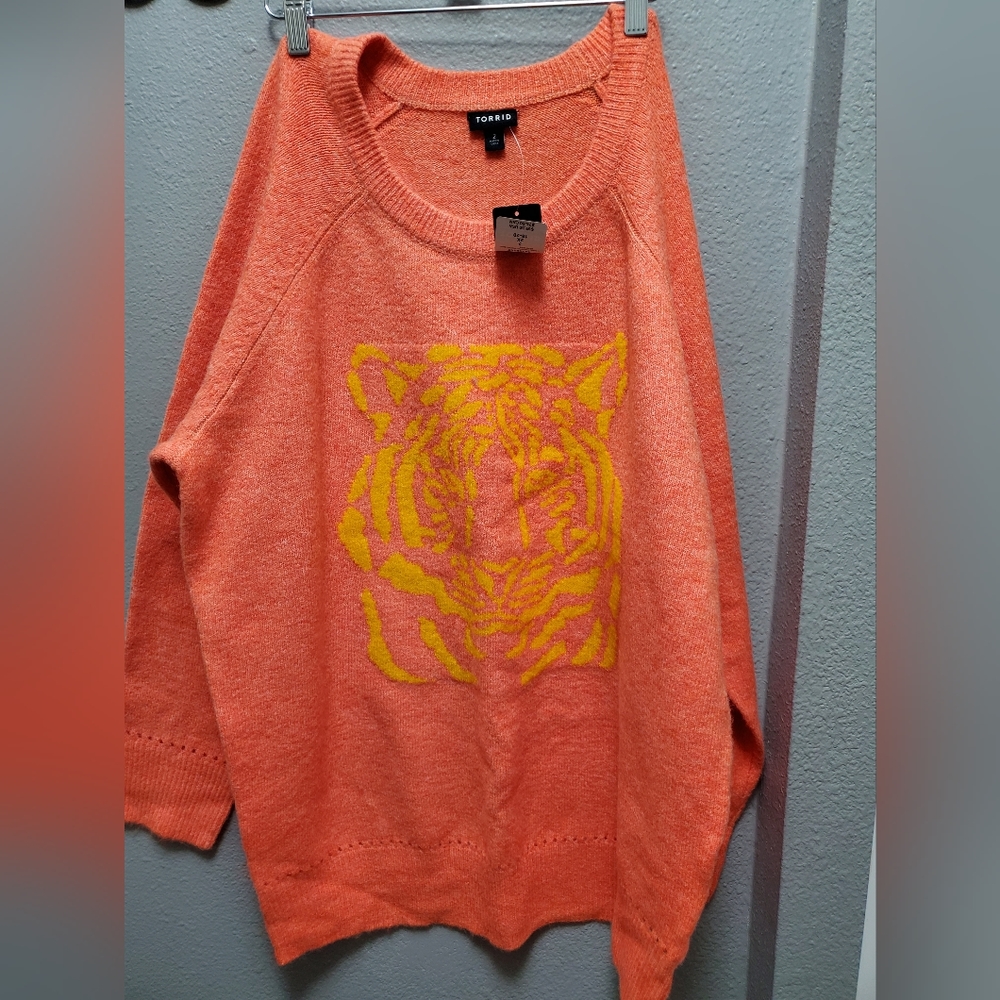 Torrid raglan pullover sweater, coral with yellow tiger, size 2, new with tags, smoke free home.