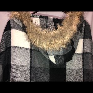 Black and white plaid with clasp and fur collar