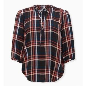 Torrid Rayon Twill Ruffle Trim Tie Neck Peasant Style Plaid Popover Top