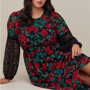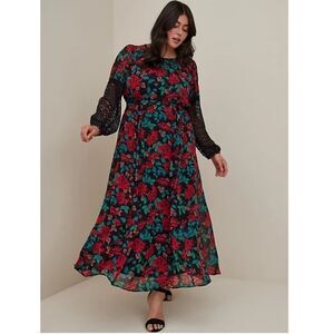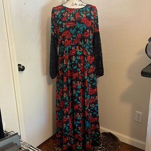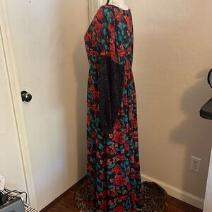 Torrid Red Black Floral Lace Sleeve Print Design Peasant Boho Maxi Dress.