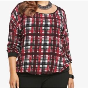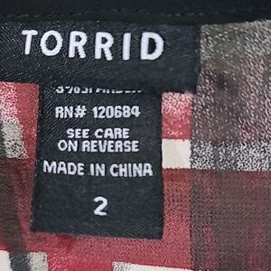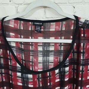 Torrid Red & Black Plaid Plaid Sheer Blouse Banded Waist Quarter Sleeves Plus 2X