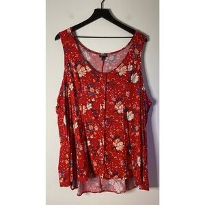 Red floral challis tank from Torrid. Button front. Fit and flare silhouette. Scoop neck. Adjustable back waist. Princess seams. Size 4 (4X). Approximate flat lay measurements- Bust: 25” across from armpit to armpit. Length: 30”. Gently preowned condition with no tears or stains.