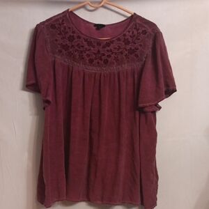 This relaxed red blouse from Torrid features short flutter sleeves and a beautifully embellished neckline. The loose, flowing design offers both comfort and style, making it perfect for any casual occasion. This is pre owned.
