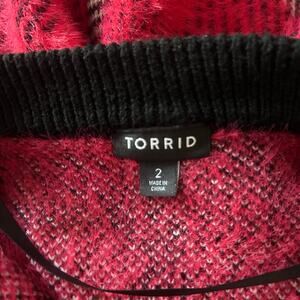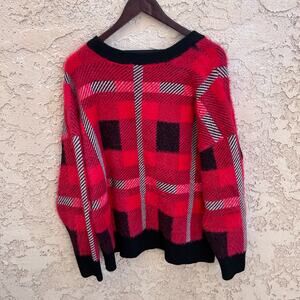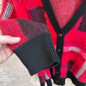 Bold and cozy Torrid cardigan in a soft fuzzy red plaid pattern with black and white check accents. Features a button front and ribbed cuffs and hem. Ultra-comfortable with an oversized, relaxed fit — perfect for layering. Size 2X.