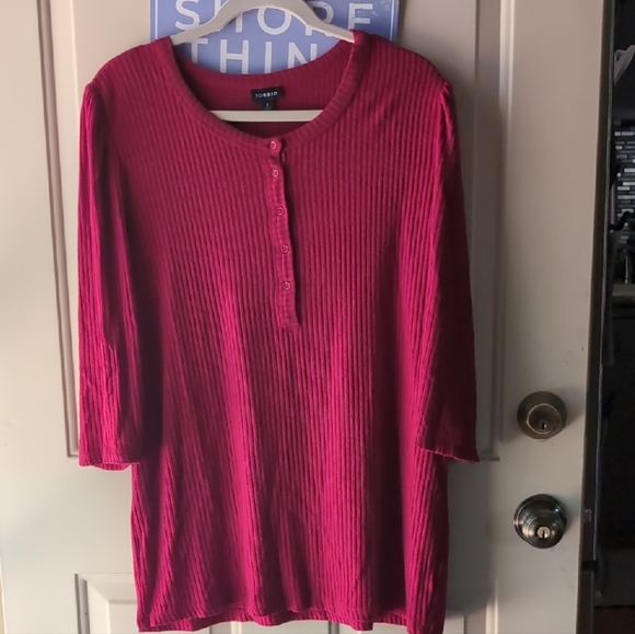 This red ribbed 3/4 sleeve henley from Torrid features a ribbed texture and a classic collar. The buttoned design adds a touch of sophistication, making it perfect for both casual and semi-formal occasions. Its soft fabric ensures a comfortable fit throughout the day.