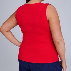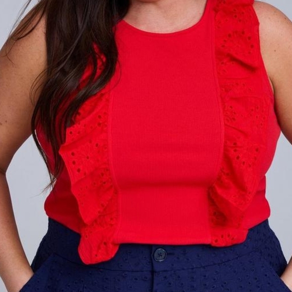 Chic red tank with ruffle details. Perfect for casual outings.