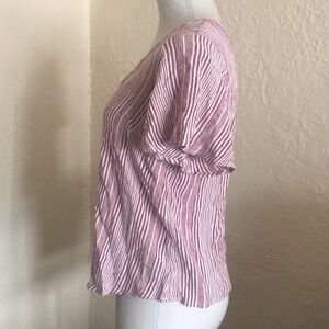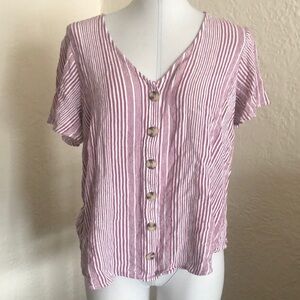 A v-neckline and flutter sleeves lend polish to this striped button-front top.