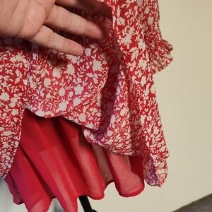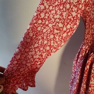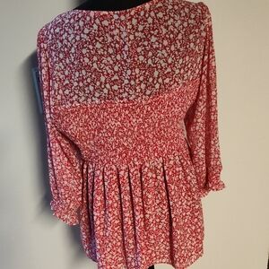 Chic Torrid blouse with a red and white floral pattern. Features a square neckline and long sleeves. Perfect for casual outings.