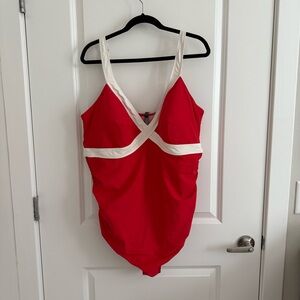 Stylish red one-piece swimsuit with white trim. Features a flattering wrap design. Perfect for beach or pool.