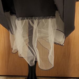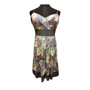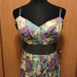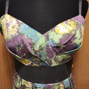Floral print, asymetrical fit. Sweetheart neckline with tucked bodice and grey attached sash. Adjustable straps, can be hidden if you like strapless. Lining has crinoline hem for that extra lift. Size 24W. Perfect condition!