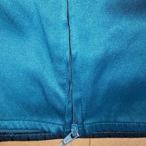 Absolutely stunning color, great vintage look! Beautiful teal colored "satin" look body fabric with some stretch and a subtle sheen to it. Sexy, sweetheart neckline, French dot style patterned mesh overlay on bust cups and in a center panel of blouse. Super flattering shirred/gathered side panels, shirred/gathered fabric on bust for bust enhancement, vintage inspired corset look. Back: elastic band stretch, tailored seams, upside down zipper for easier removal, black satin ribbon lingerie straps. Very versatile piece to add to your wardrobe. Either wear this top alone for a sexier look or add on a jacket or sweater for a totally different look!