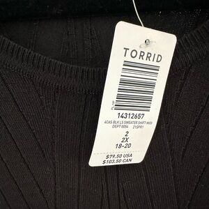 Chic black midi length shift dress with ribbed texture and 3/4 length sleeves. Perfect for day or night. Torrid size 2 (18/20) NWT.