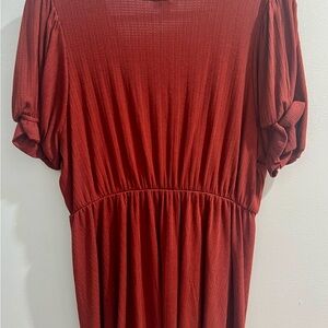 This stylish sundress from Torrid features a vibrant brick hue, a flattering V-neckline, and charming short puff sleeves. The wrap design with a tie front adds a touch of elegance, making it perfect for both casual outings and work settings.
