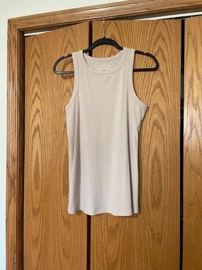 Experience comfort and style with this tank top. Perfect for any casual outing or layers. neutral colored ribbed top. Tan/beige colored, super soft, good condition please see pictures of light piling under arms. Wear with a denim jacket or cute open sweater!