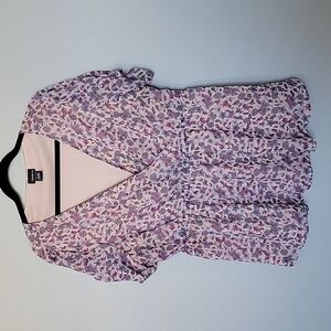 Background is a tan pink color with purple, red and blue florals. Surplice at the chest. Body is lined. Sleeves are sheer and have a gathered look. 1 sleeve does have a run in the fabric, I don't feel it's noticeable, found upon close inspection. There is a run in the back towards the bottom as well, see pic. Workplace siren, officecore, corpcore, spring, summer, girly, feminine, Y2K, office, workplace, girls night, hang out, dinner, date night, garden, cottage, dainty, curvy, plus
