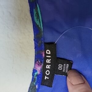 Doesn't stretch. Short, sheer flutter like sleeves. Body is lightly lined. Lace detail at the chest. Dot raised texture. Gorgeous vibrant blue with lavender flowers. Girly, flirty, bold, colorful, sweet, twee, officecore, corpcore, gathering, outing, pictures, concert, festival, rodeo, teacher dopamine