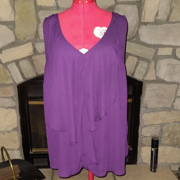 Pretty purple dressy blouse by Torrid. Great for professional attire and business casual. Sleeveless and somewhat sheer (pic 4). Loose fitting, size 4. Great condition.