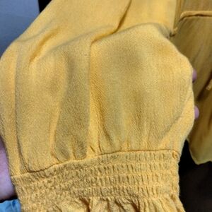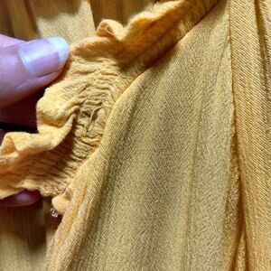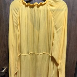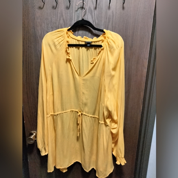 Yellow tunic from Torrid. V-neck, ruffle design around neck & at sleeves. Cinch & tie at waist, not lined. Size 3 (22/24). 100% rayon.