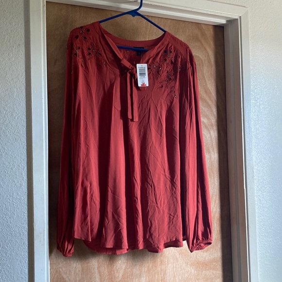 100% Rayon Rust (perfect for the fall) Brand New (bought this July 2022) Never been used Beautiful top Unfortunately too big