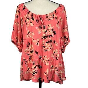 Torrid SZ 1 (1X-Large) Babydoll Top Floral Stretch Gauzy Boat Neck Keyhole Pink
