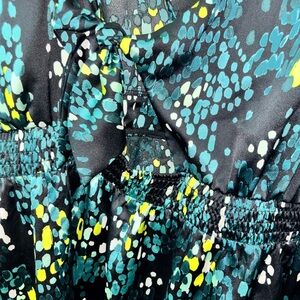 Stylish blouse with a surplice neckline. Features a unique black and green pattern. Perfect for versatile wear.