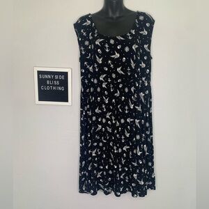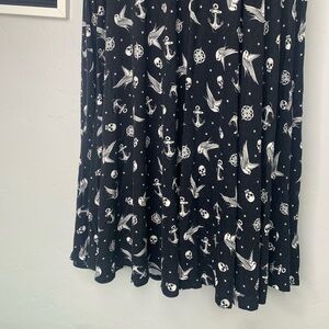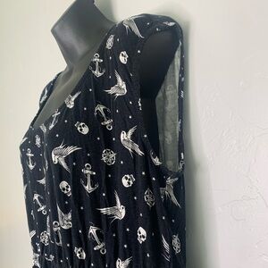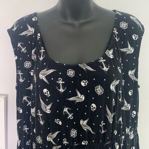 This is a black scoop neck dress with white graphics of sparrows, skulls, anchors and compass’s all over with a key hole back detailing. It’s a size 2XL in good pre owned condition no satin or flaws.