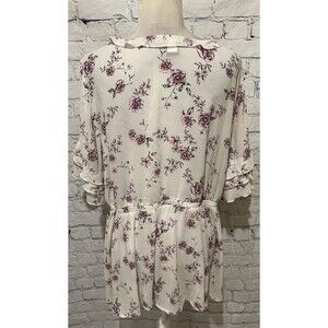 The Torrid Sheer Floral Faux Wrap Surplice Empire Waist Blouse in size 2X is a stylish and versatile top perfect for various occasions. This blouse features a flattering V-neckline, short sleeves, and a ruffle detail that adds a touch of femininity. Made from chiffon material, it has a sheer floral pattern in a white color, making it ideal for summer, fall, and spring seasons. The pullover closure and empire waist silhouette offer a comfortable and flattering fit, while the brand Torrid ensures quality and plus-size availability. 25 inches pit to pit, 36 inch elastic waist and 29 inches long. Smoke free home.