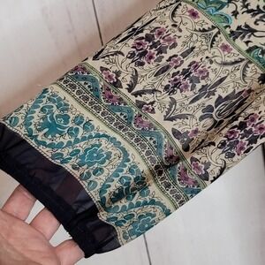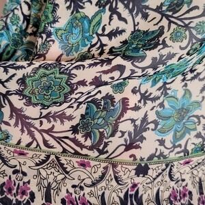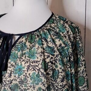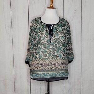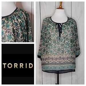 Beautiful shades of green and blue floral print peasant top by Torrid. Ties at the neck and has a 3/4 length sleeve. Sheer so will need a cami underneath. Size Large/ 0/ 12