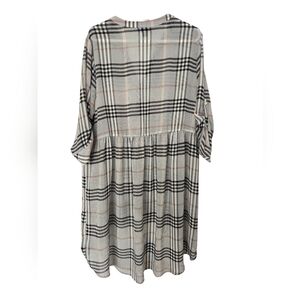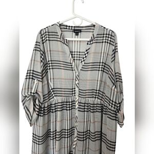 Stylish plaid tunic with button-up front by torrid. Features a classic black and white check pattern with subtle tan accents. hi low cut, button cuffs, beautiful piece