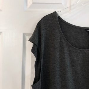 Tulip front of this super-soft style adds movement, while side shirring flatters you in all the right places. Charcoal heather color. Good stretch.