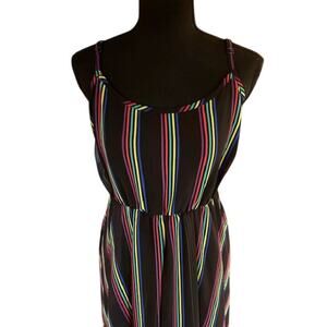 Torrid sleeveless midi dress in black with colorful vertical stripes. Scoop neckline, elastic waistband, and adjustable spaghetti straps. Lightweight and flowy, perfect for summer or layering with a jacket or cardigan. Size 0 (Torrid sizing = approx. women's 12). No flaws noted.