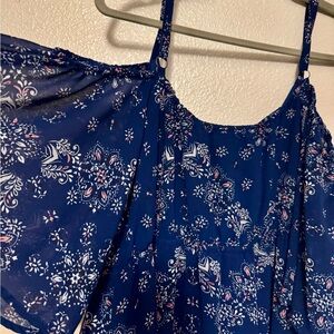 Blue cold shoulder dress with floral patterns. Torrid size 1 or 16 pls size. Lined.