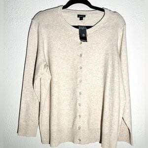 This Torrid cardigan is a size 2X in plush tan fabric with a button-down style. It is brand new with tags and features a classic cardigan design suitable for travel, casual outings, or business wear. The sweater has long sleeves and is in a solid beige color, making it a versatile piece for the winter, fall, or spring seasons.