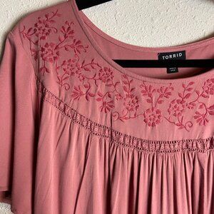 Torrid Size 3 Mini Challis Embroidered Dress Pink Short Sleeves Boho Belt 3X