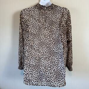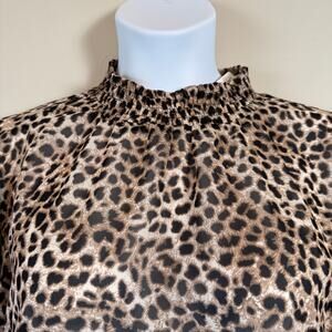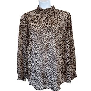 100% polyester, bold leopard print, semi-sheer, ruffled mock neck, shirred bloused sleeves with elastic cuffs, back keyhole closure, flowy, machine wash