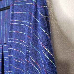 Dark blue with multi color stripes. Open front light weight knit cardigan sweater.