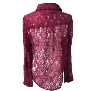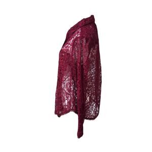 The Torrid Size M/L 10 Madison Zinfandel LS Lace Blouse is a stylish and versatile top perfect for various occasions such as weddings, parties, casual outings, and workwear. This floral pattern blouse features a V-neckline, long sleeves, and a button closure for a classic look. Made from a combination of nylon and rayon with a lace fabric type, this lightweight blouse is sheer and ideal for wearing during all seasons. The burgundy color adds a touch of elegance to the overall design, making it a must-have in any woman's wardrobe.