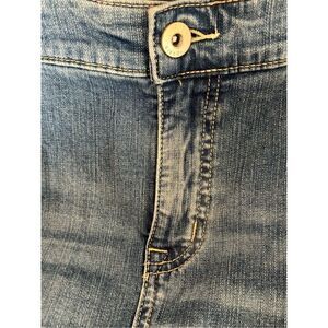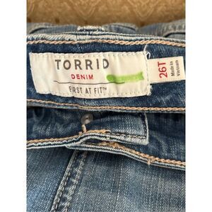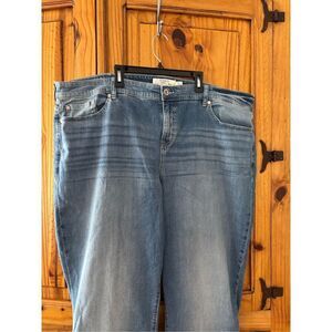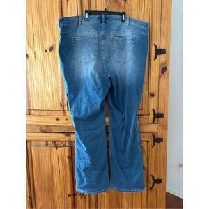 Cotton and spandex. Rise is 13 inches. Waist measures 48 inches and the inseam is 35.25 inches.